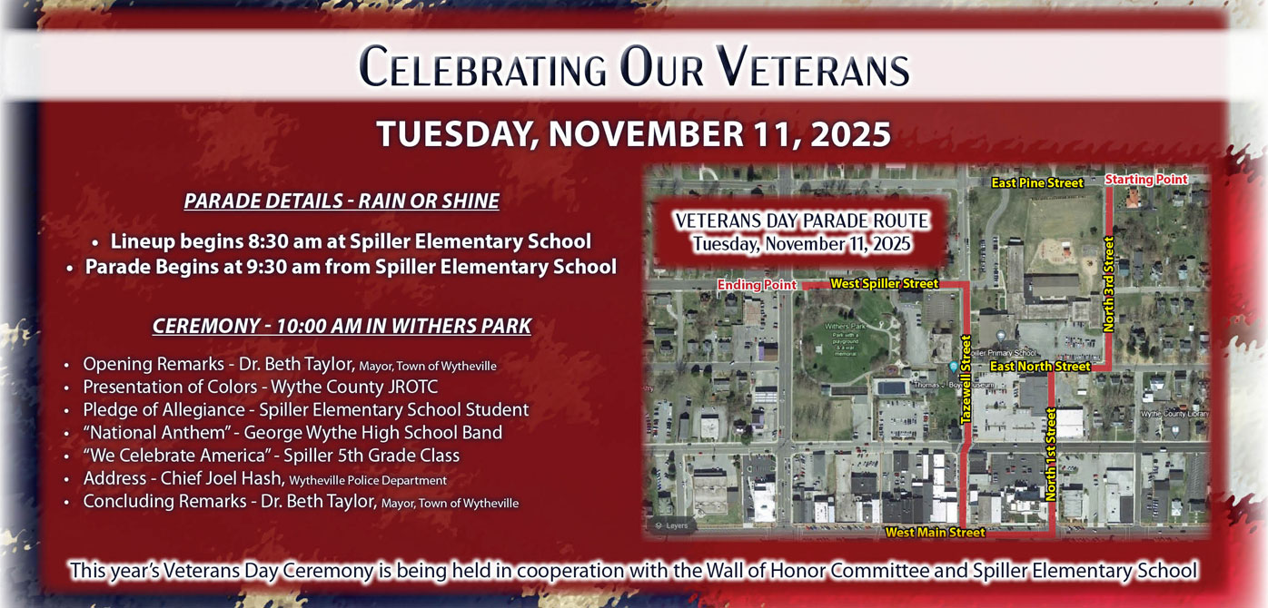Due to the Veterans Day holiday, the refuse collection in the Town of Wytheville for Tuesday, November 11, 2025, will be held on Wednesday, November 12, 2025. The normal collection scheduled for Wednesday, November 12, 2025, will be held on that day.